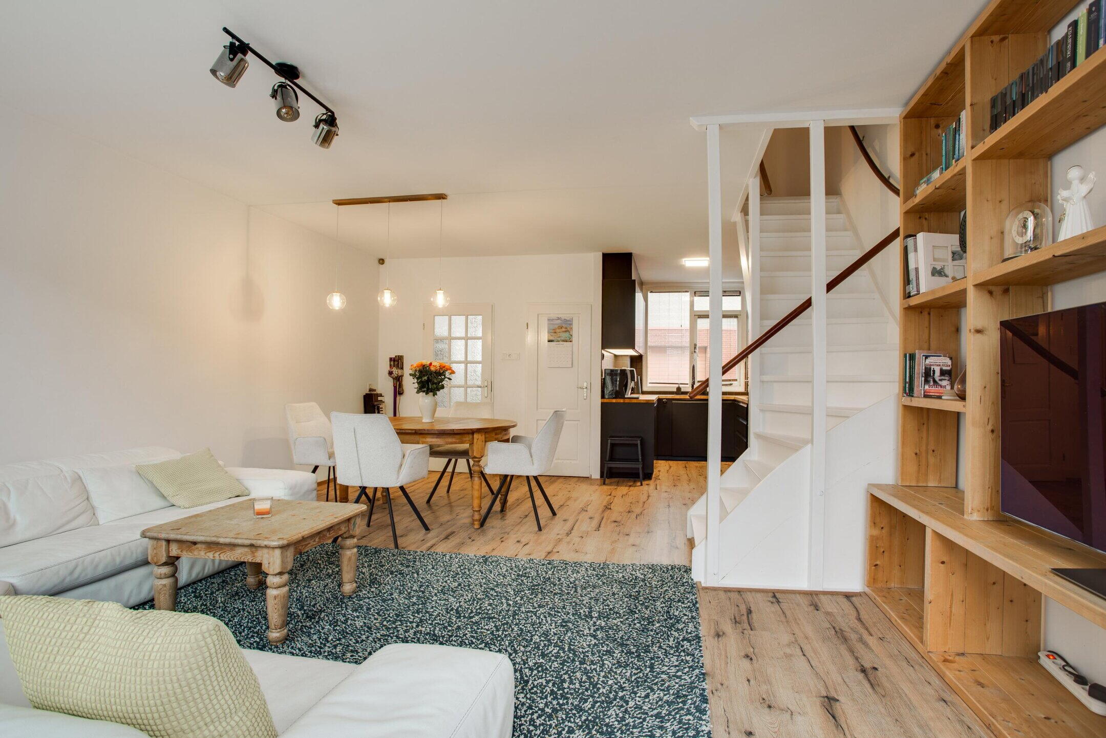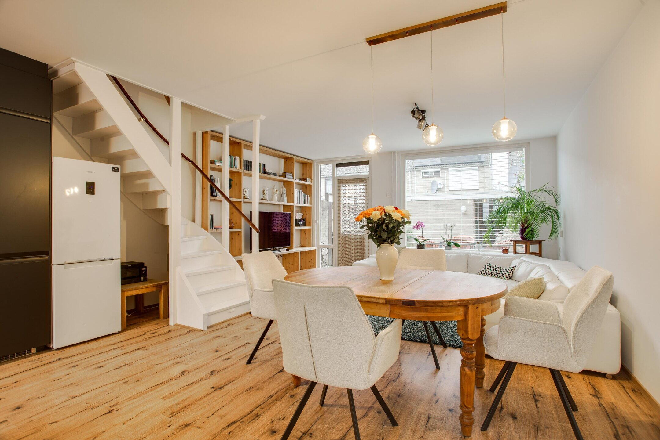 Via de entree komt u in de hal met meterkast en een separaat toilet. Vanuit hier bereikt u de woonkamer, een prettige en lichte leefruimte met grote raampartijen aan de achterzijde die zorgen voor een aangename lichtinval. De ruimte is praktisch in te delen met een comfortabele zithoek en een ruime eethoek, wat bijdraagt aan een comfortabele leefruimte.