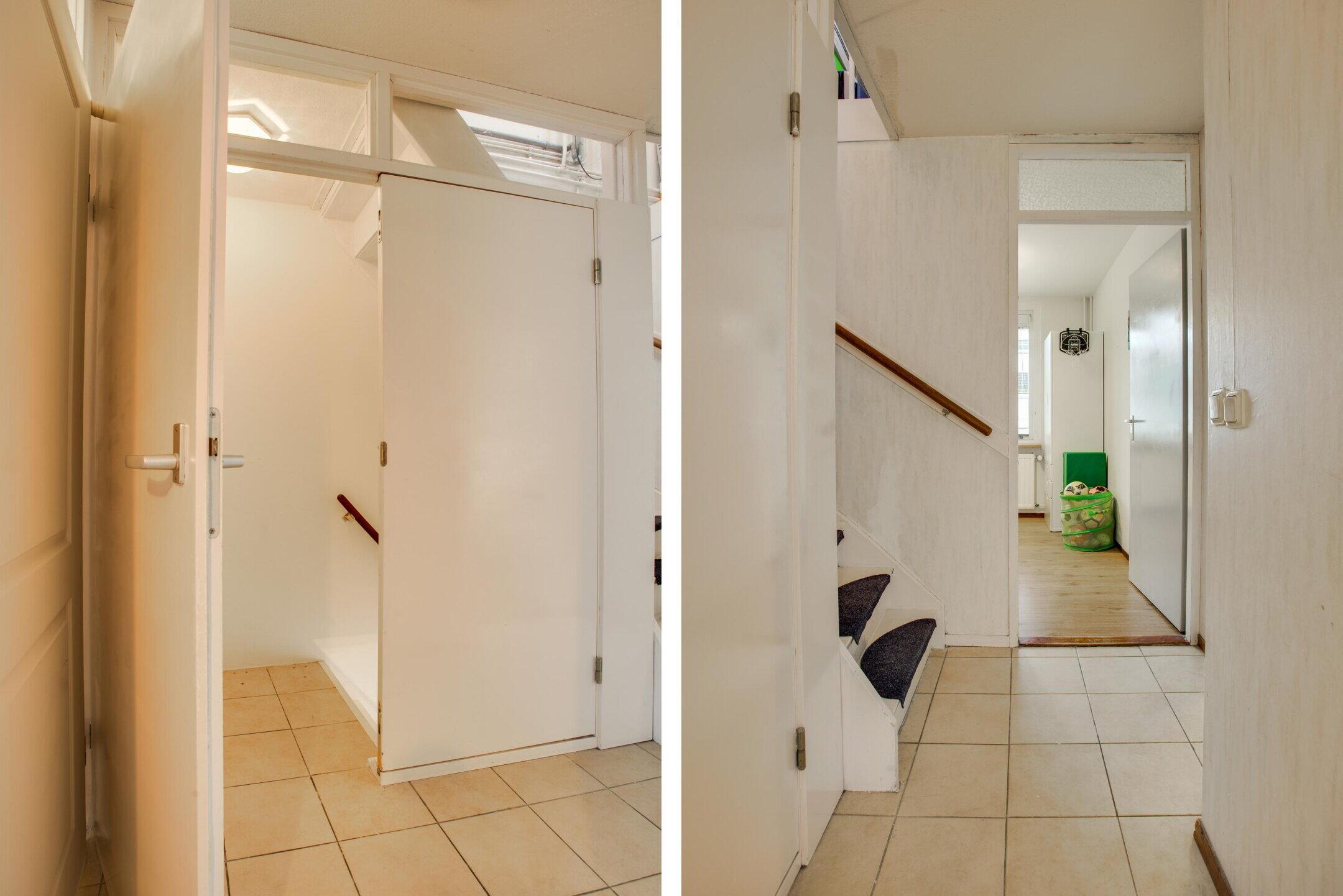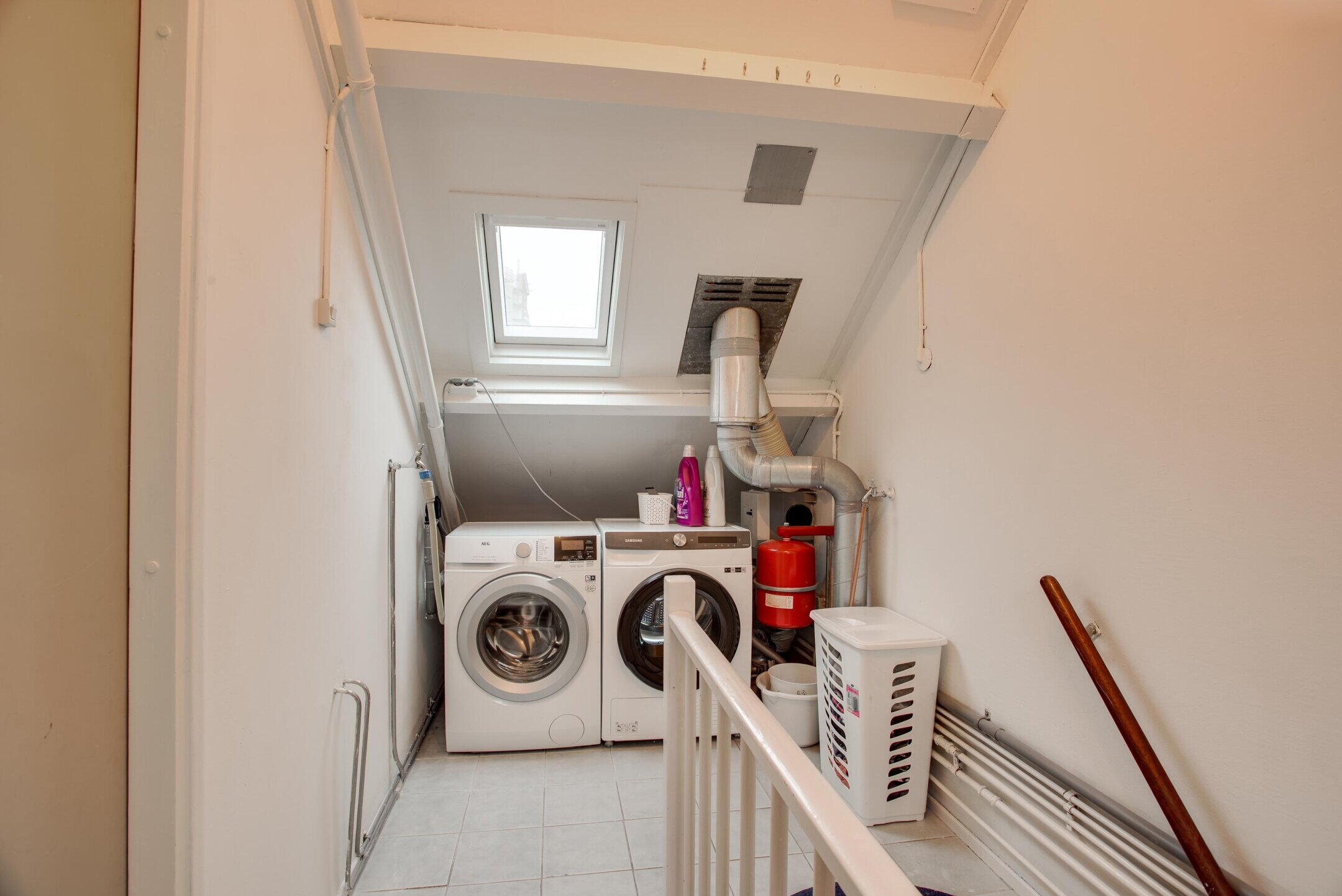 De tweede verdieping bestaat uit een ruime overloop en een volwaardige slaapkamer. Op de overloop bevinden zich de aansluitingen voor de wasmachine en droger, netjes uit het zicht gesitueerd, evenals de opstelplaats van de cv-installatie.