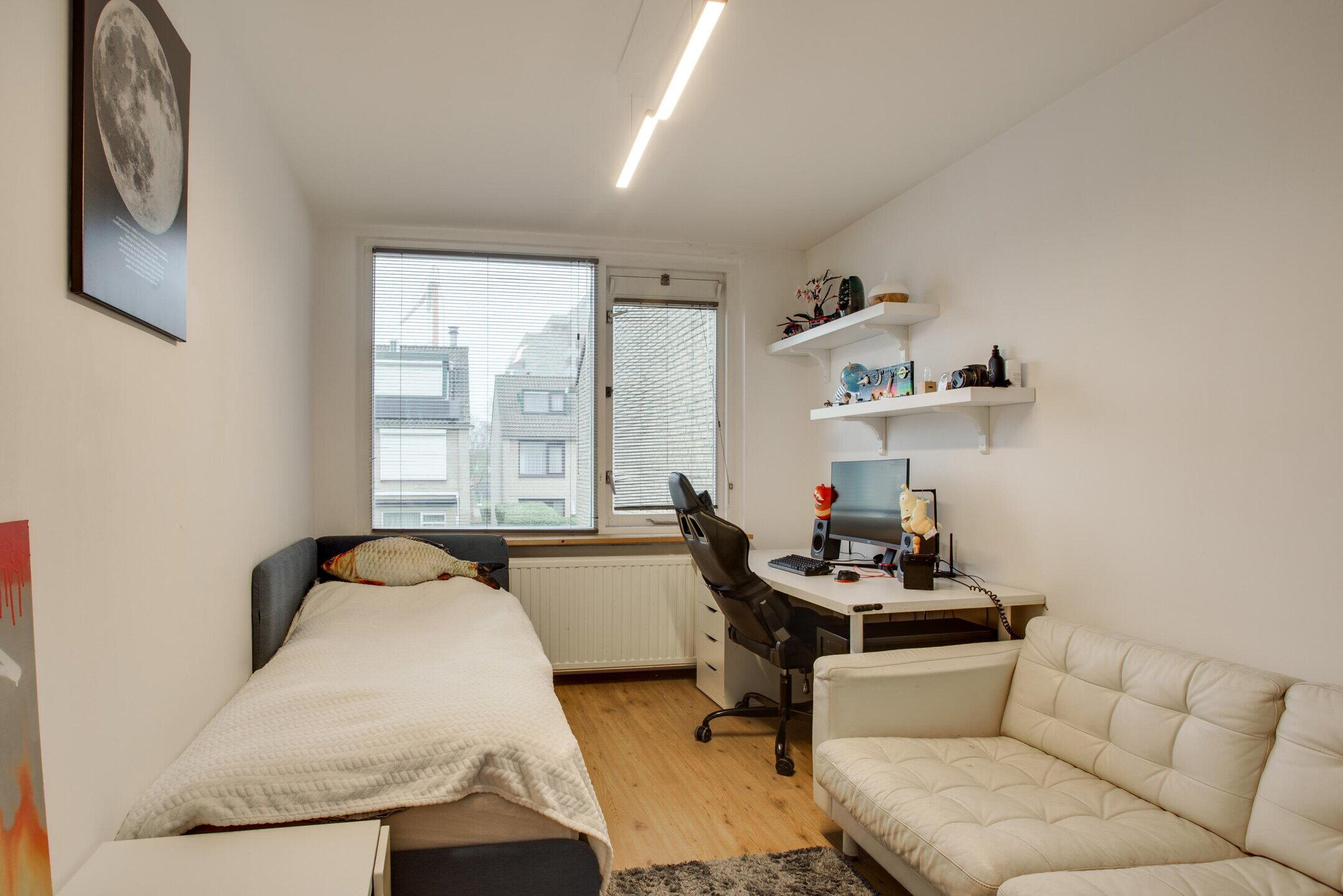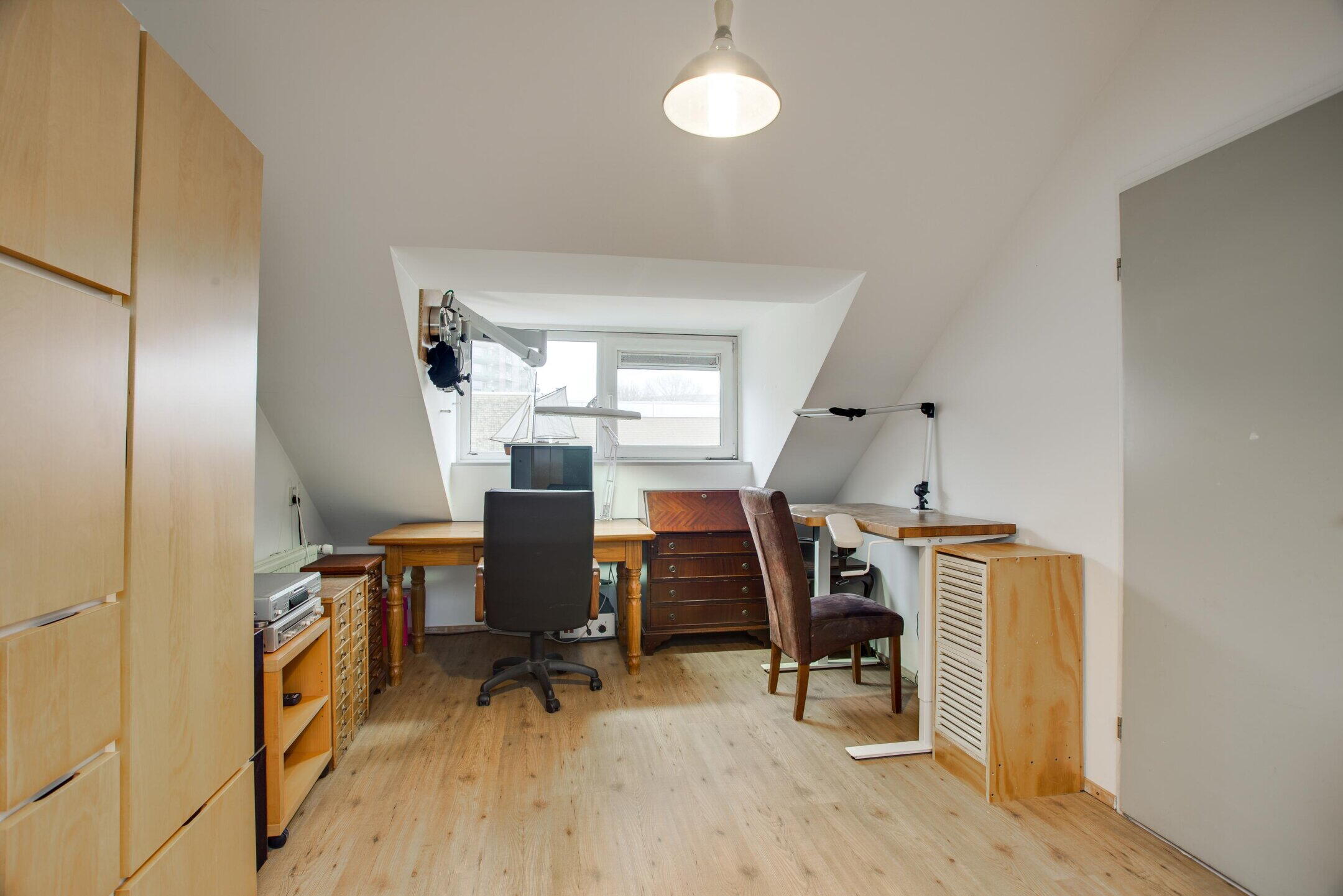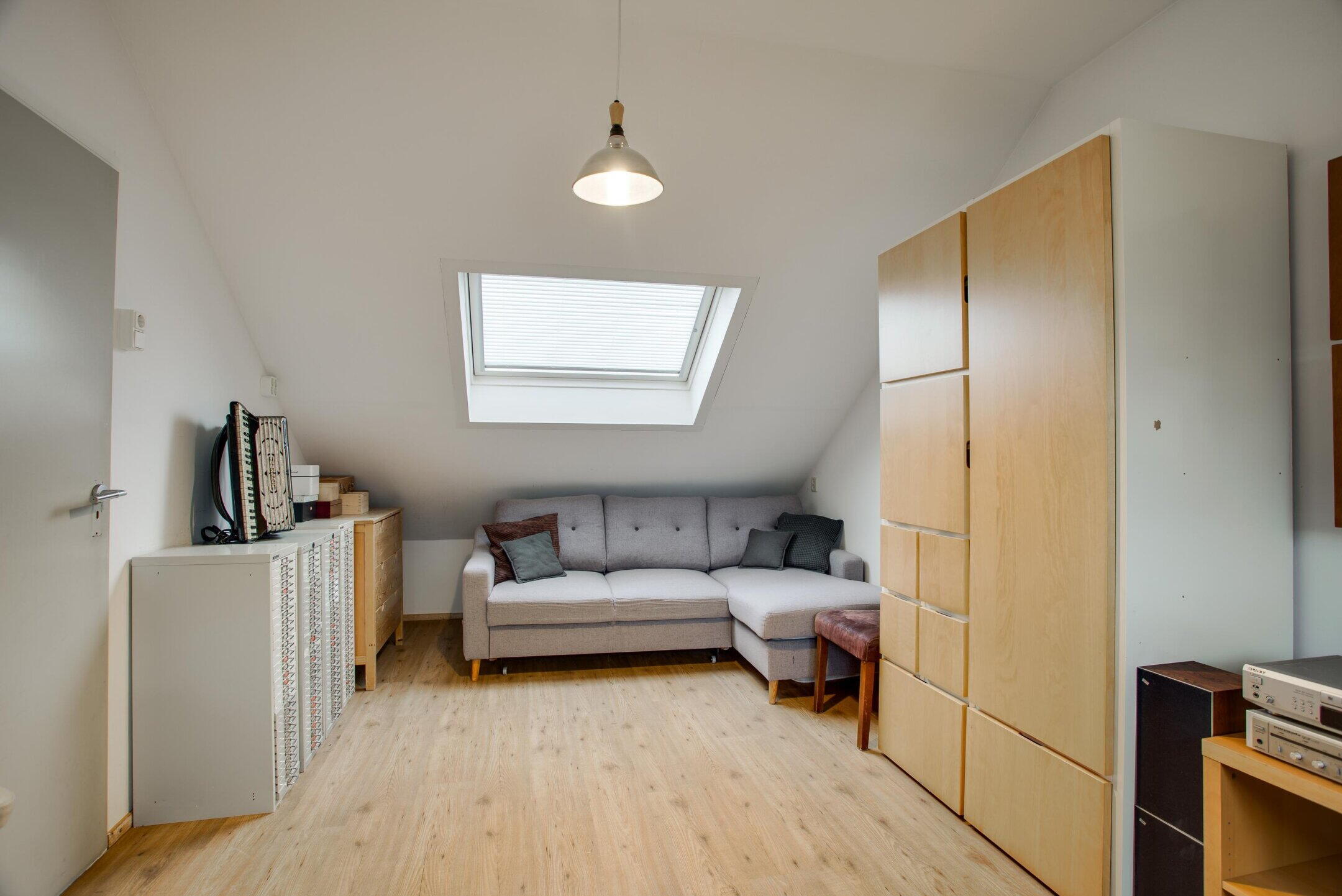 De slaapkamer is prettig van formaat en profiteert aan de voorzijde van een dakkapel, wat zorgt voor extra ruimte en een aangename lichtinval. Hierdoor is dit een comfortabele en veelzijdige kamer, geschikt als extra slaapkamer, werkkamer of hobbyruimte.