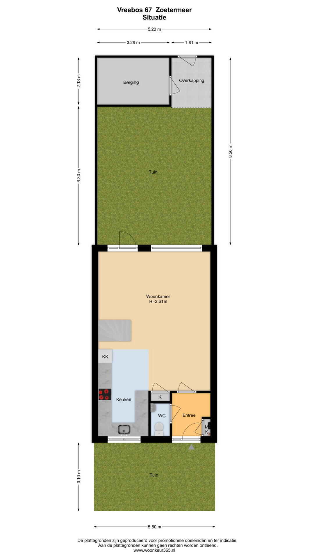- 44 m² (8.5 meter diep en 5.2 meter breed)